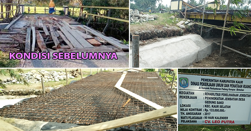 PORTAL KAUR – Harapan masarakat kabupaten Kaur, khususnya warga Desa Gedung sako dan Desa Jembatan Dua Kecamatan Kaur selatan soal direhabilitasinya jembatan telah terpenuhi. Pemerintah Daerah setempat melalui kontraktor pihak ketiga yakni CV Leo Putra mulai melksanakan rehabilitasi jembatan tersebut.