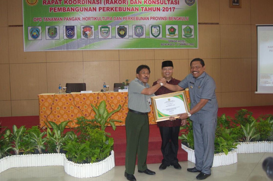 Penghargaan tersebut diterima oleh Bupati Mian di Grage Hotel Bengkulu yang dihadiri langsung Dirjen Perkebunan, Ir. Bambang, MM, Selasa (21/03).