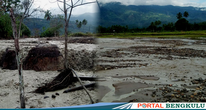 “Akibat dari longsor tahun 2016 lalu, menyebabkan terjadinya pendangkalan DAS. Sehingga ketika hujan turun dan debit air naik alur sungai tak mampu menampung dan akhirnya air menyebar kemana-mana menerpa daerah persawahan dan merusak jalan utama akses ke perkebunan masyarakat,” jelas Kades.