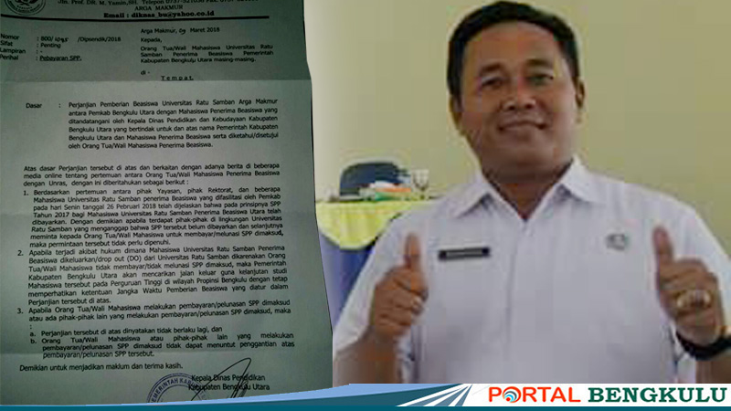 PORTAL BENGKULU UTARA – Dinas Pendidikan (Dispendik) Kabupaten Bengkulu Utara melalui suratnya nomor 800/1085/Dispendik/2018, tanggal 09 Maret 2018 yang disampaikan kepada masing-masing orang tua atau wali mahasiswa Unras penerima beasiswa Pemkab BU, antara lain menyebutkan, permintaan rektorat tentang SPP tidak perlu dipenuhi.