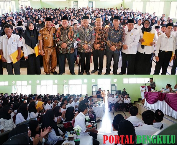 PORTAL MUKOMUKO – Masih dalam rangkaian agenda kunjungan kerja Gubernur Bengkulu, Rohidin Mersyah ke Kabupaten Mukomuko, Pada Senin (24/2), Gubernur menyapa dan menyerahkan sebanyak 458 SK PTT dan GTT se Kabupaten Mukomuko. Penyerahan SK digelar di aula MAN 2 Mukomuko yang berlokasi di Kelurahan Bandar Ratu, Kecamatan Kota Mukomuko, Kabupaten Mukomuko. Turut hadir dalam penyerahan SK, pejabat Pemprov Bengkulu, Bupati Mukomuko, H Choirul Huda, SH, Sekdakab Mukomuko, Drs. Marjohan dan pejabat lainnya.