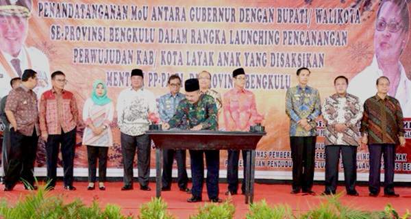 PORTAL – Pencanangan Perwujudan Kabupaten/Kota Layak Anak (KLA) dan penandatanganan MoU Gubernur dengan Bupati/Walikota se-Provinsi Bengkulu tahun 2017, di Kabupaten Rejang Lebong, Jumat (12/5/2017) dihadiri Deputi Bidang Perlindungan Anak (BPA) KemenPPPA.