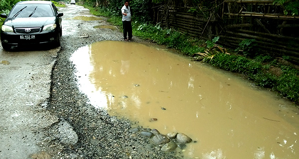 Selain terdapat lubang yang cukup dalam, lapisan penetrasi (Lapen) sudah rusak dan mengelupas disepanjang jalan tersebut, sehingga dikhawatirkan bakal menjadi penyebab terjadinya kecelakaan khususnya bagi kendaraan bermotor roda dua.