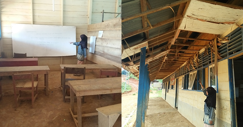 Selain bangku belajar tidak mencukupi dan kumuh, dinding ruanganya terbuat dari papan lusuh, plafond atau langit-langit ruanganpun rontok, ditambah lagi lantai yang tersisa hanya berupa tanah berdebu bila cuaca mulai panas. Tentu membuat suasana sangat tidak nyaman dalam proses belajar mengajar di SD tersebut.