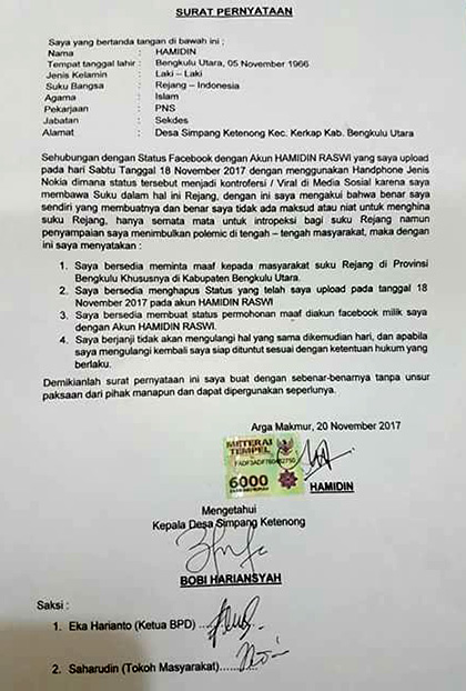 Saya meminta maaf kepada seluruh masyarakat Rejang dimanapun berada atas status yang telah saya unggah dan saya posting pada tanggal 18 November 2017 kemarin, tidak semata-mata saya merendahkan Suku Rejang melainkan hal itu merupakan bentuk keprihatinan, selanjutnya ini merupakan pelajaran bagi saya didalam menggunakan media sosial, saya terbuka untuk dikritik, kecewa terhadap saya, begitupun marah, saya menerima hal tersebut dan saya siap bertanggung jawab atas semua ini.
