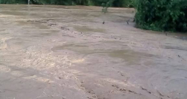 Ketinggian air tampak mencapai bibir jembatan setempat, yang diperkirakan akibat dari derasnya hujan yang terjadi di hulu sungai.
